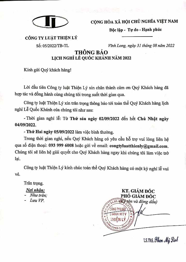 Công ty luật Thiện Lý xin trân trọng thông báo tới toàn thể Quý Khách hàng lịch nghỉ Lễ Quốc Khánh của chúng tôi như sau: